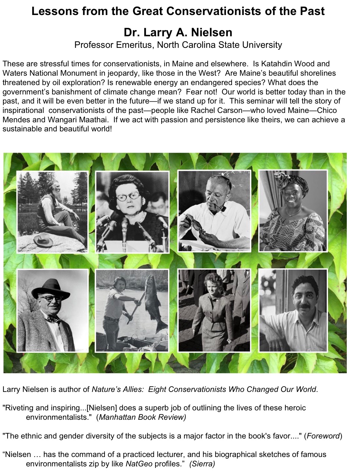 Schoodic Institute is pleased to welcome Dr. Larry A Nielsen to campus, Tuesday, August 21, 2018. Dr. Nielsen’s presentation is entitled ‘Lessons from the Great Conservationists of the Past’ and is offered free and opened to the public. The program begins at 7:00 PM in Moore Auditorium on the Institute campus. Nielsen’s book, “Nature’s Allies” will be available for sale. Cost is $20.00. Cash only please.