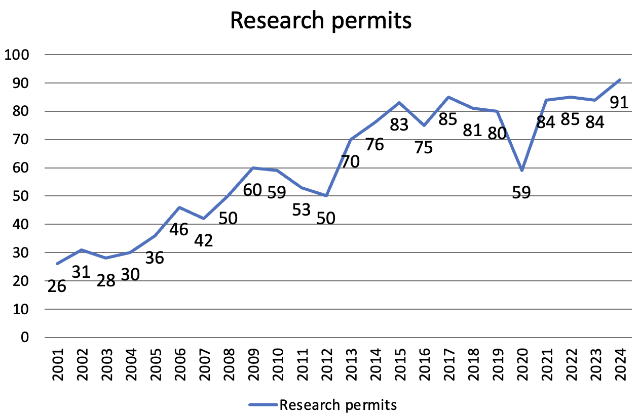 In 2024, we approved a record number of permits for research in Acadia National Park. The number of research permits has been increasing ever since the local community founded Schoodic Institute at Acadia National Park more than two decades ago. Several fellowship programs have helped to increase the amount of permitted research in Acadia, including the Fitz Eugene Dixon Research Fellowship in 2006, LL Bean Research Fellowships in 2009, and Second Century Stewardship fellowships from 2016 until 2024, when it was re-imagined as the Acadia Science Fellowship. Since ~2013, Schoodic Institute has grown a small dedicated staff of scientists leading many lines of ecosystem science from sea to trees in Acadia. Research permits did dip down in 2020 due to the pandemic, but then bounced back to typical levels the next year.